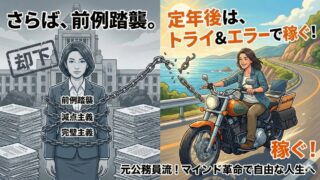 組織を出た生き方 公務員マインドを捨てろ!定年後の「稼ぐ力」を爆発させるトライ&エラー思考法 定年後の再雇用や収入減に不安を感じる公務員へ。「前例踏襲」や「完璧主義」といった公務員マインドが、なぜ稼げない原因になるのかを解説。元公務員が実践する、失敗を恐れず成果を出すための思考法と具体的なアクションプランを紹介します。 2026.01.15 組織を出た生き方